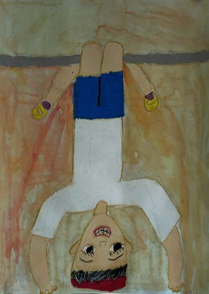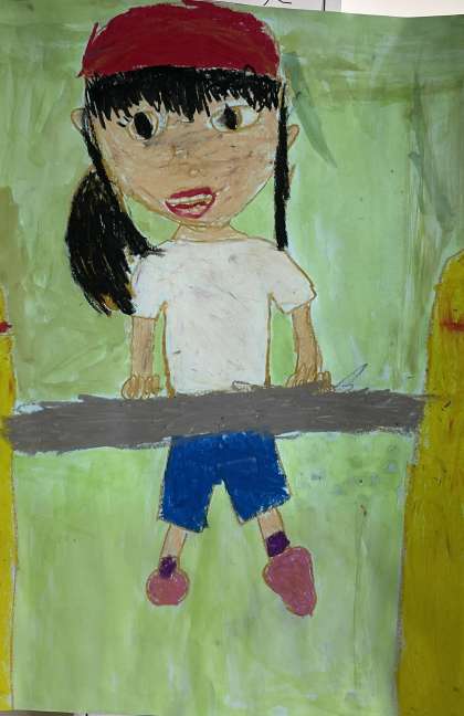 2年生の図工の作品を紹介します。鉄棒する自分のようすを思い浮かべながら、気持ちが伝わるように描きました。