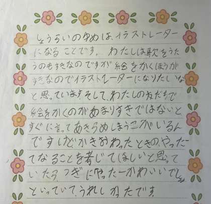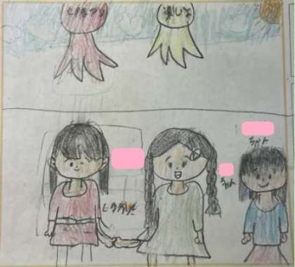 作文とイラストの作者は3年生です。イラストレーターになりたい思いを描いてくれました。たくさんイラストを描いて、ノブッダくんにも見せてくださいね。イラストの題は「七夕まつり」です。みんなで楽しい時間を過ごすことができたかな。