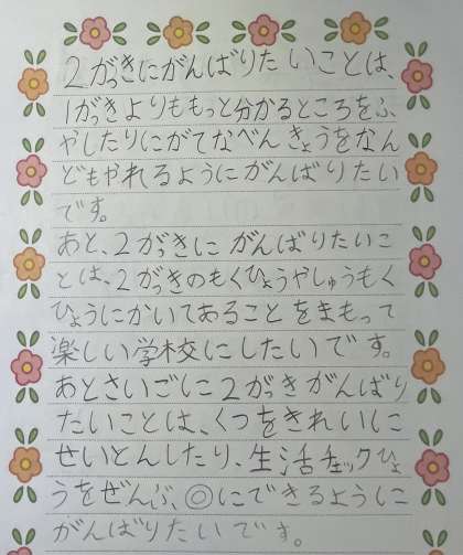 作文とイラストの作者は3年生です。2学期にがんばりたいことを書いてくれました。自分で頑張ったことを自分で花丸をつけられるように、すてきな2学期を過ごしてほしいと思います。ノブッダくんも応援していますよ!イラストの題は「1学期勉強をがんばったようす」です。