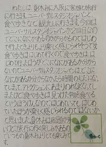 作文とイラストの作者は6年生です。楽しみにしている大阪旅行について詳しく描いてくれました。すてきな旅行の思い出話を楽しみにしていますよ。暑い中でも元気に旅行できるように「早寝・早起き・朝ごはん」のリズムで健康な体をつくっていきましょうね。