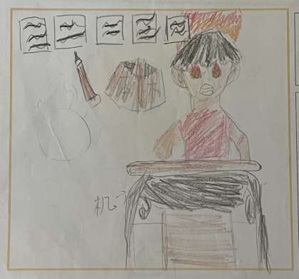 作文とイラストの作者は6年生です。1学期一生懸命宿題に取り組んだ様子が書かれていました。がんばりましたね。2学期も毎日コツコツとやりきって力をつけてくれるように応援していますよ。イラストの題は『宿題』です。机に向かって燃える心が伝わってきますね。