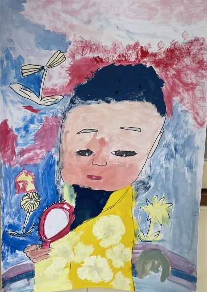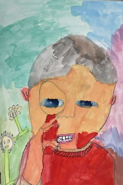 8月9日(金) 3年ウェブ展覧会【あの日あの時の気もち】 公開日 2024/08/09 更新日 2024/08/09 3年 3年生は理科の授業で虫めがねを使いました。何を観察するのかワクワク!どんなふうに見えるのかドキドキ!そんな気持ちを思い出しながら描いた作品です。