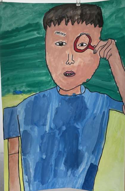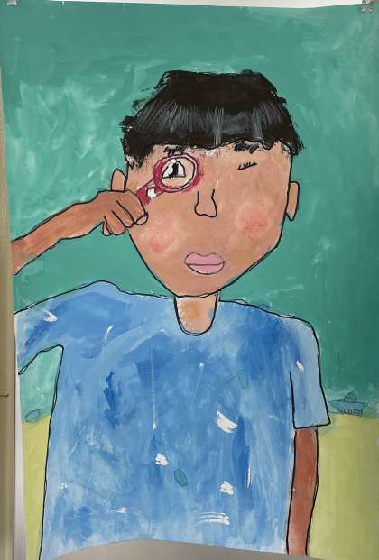 3年生は理科の授業で虫めがねを使いました。何を観察するのかワクワク!どんなふうに見えるのかドキドキ!そんな気持ちを思い出しながら描いた作品です。