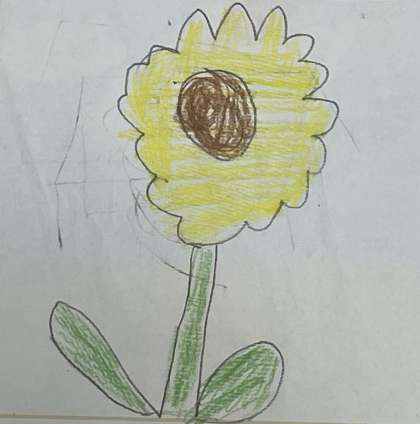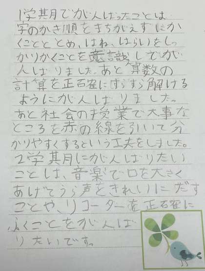 作文とイラストの作者は6年生です。授業について1学期にがんばったことや2学期にがんばりたいことを書いてくれました。イラストの題には「ひまわり」と書かれていました。ひまわりのように元気に明るく2学期も充実した生活ができるように応援しています。