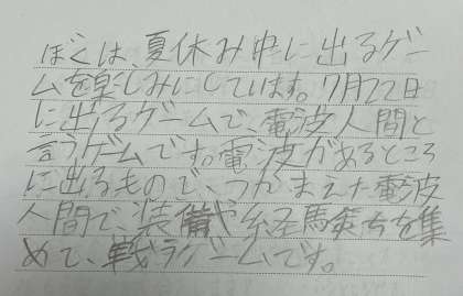 作文の作者は6年生です。夏休みに立しみにしているゲームのことについて書いてくれました。時間をきめて健康的に楽しんでくれるといいなと思います。イラストの作者も6年詩絵です。勉強と運動にがんばりたいという気持ちが伝わってきますね。2人とも充実した夏休みを過ごせるようにノブッダくんも応援しています!