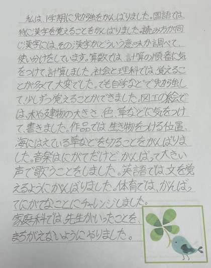 作文の作者は6年生です。1学期に授業でがんばったこと、自学で取り組んだことをとてもきれいな字で書いてくれました。2学期も充実した学習ができるように応援しています。