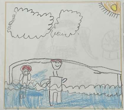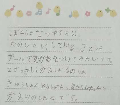 作文とイラストの作者は1年生です。プールでがんばりたいことや2学期にがんばりたいことを書いてくれました。夏休みは楽しくプールで活動して、きっと安心して顔を水につけられるようになりますね。イラストの題は「学校のプールでかおをつけたよ」です。