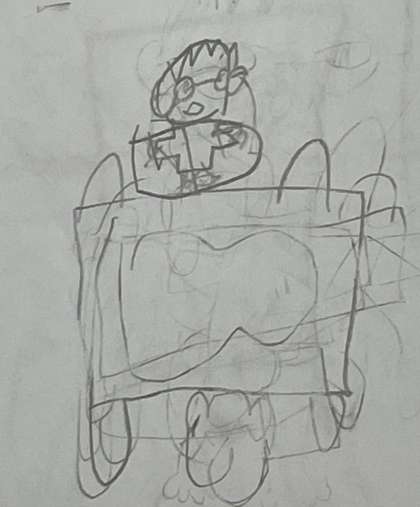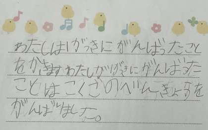 作文とイラストの作者は1年生です。1学期にがんばったことを書いてくれました。2学期も授業に一生懸命取り組んで、できることを増やして自信をふくらませていけるように応援しています。イラストの紹介は「1がっきにがんばったようす」と書かれていました。