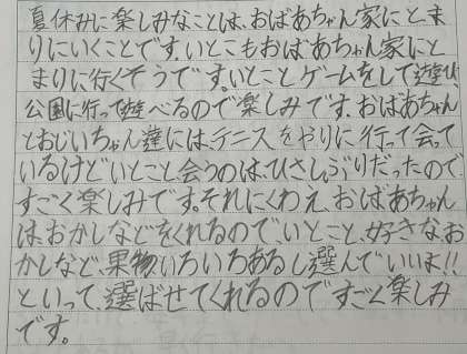 作文の作者は5年生です。夏休みにおばあちゃんの家に行って親せきのみんなに会えることを楽しみにしている気持ちを書いてくれました。小学校でがんばっていることを伝えるなど、お話をたくさんしてしあわせな時間を過ごしてきてくださいね。