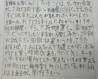 作文の作者は5年生です。2泊3日のサッカー合宿を楽しみにしている気持ちを書いてくれました。サッカーを上達させるだけでなく、楽しそうなことがたくさんあるのですね。健康に気をつけて、友情とチームワークが深まるすてきな合宿になることを応援しています。