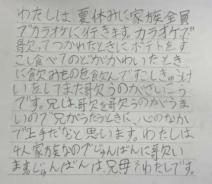 作文とイラストの作者は4年生です。歌が大好きな家族でカラオケを楽しめるって素敵ですね。そんな歌を歌うのかな。ノブッダくんにもぜひ聴かせてくれるとうれしいです。