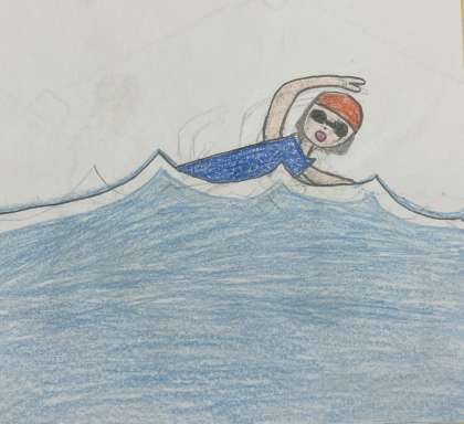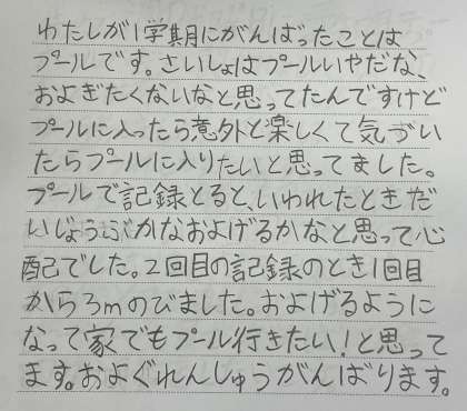 作文とイラストの作者は4年生です。苦手に感じていたプールをがんばって、記録更新ができてすばらしいですね。イラストの紹介には「自分が泳いでいる様子を表しました」と書かれていました。夏休みもプールで楽しみながら練習をがんばって記録更新できるのを応援していますよ!