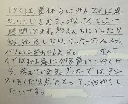作文の作者も6年生です。韓国でサッカーフェスティバルに参加することを紹介してくれています。チームで力を合わせて活躍してくれるよう応援しています!