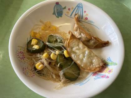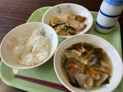 今日の給食のメニューは、ご飯、牛乳、あげギョーザ、パンサンスー、わかめスープでした。