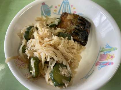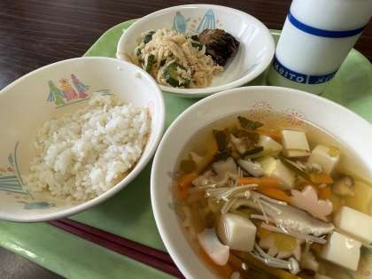 今日の給食のメニューは、金芽ロウカット玄米ご飯、牛乳、さばの味噌煮、切り干し大根のごま和え、秋のすまし汁でした!