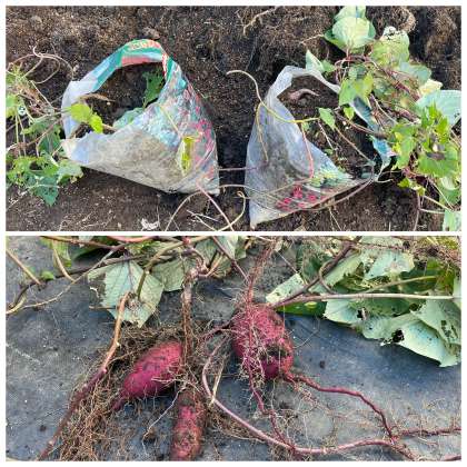 校長先生は、あまったイモの苗を植える場所がなかったので、中庭にビニル袋に土を入れてサツマイモを栽培していました。小さな袋だったのですが、今日袋を開いてみると写真のようなおイモが採れましたよ。みんなのサツマイモはマルチに守られてきっとすくすく育っていることでしょう。楽しみですね。