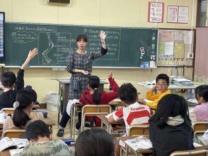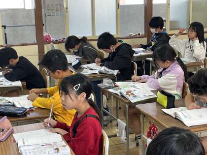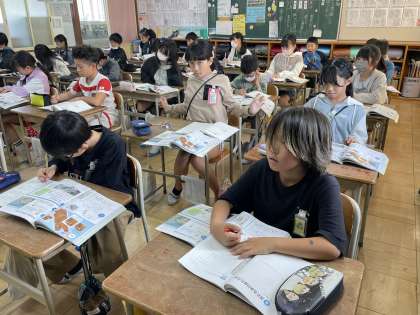 5年生の理科の授業のようすです。「流れる水にはどんなはたらきがあるのだろうか」というテーマで考え調べた結果をまとめていました。