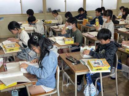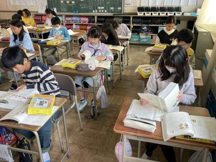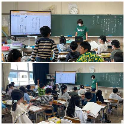 4年生の国語の授業のようすです。「慣用句を使った文を書こう」というめあてで学習を進めていました。「頭をひねる」「心がおどる」はどんな意味か、国語辞典で調べることができましたね。