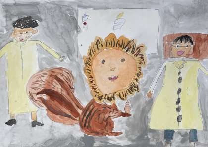 5年生の図工の作品「読書感想画」を紹介します。題は「リオンしょうかい」です。