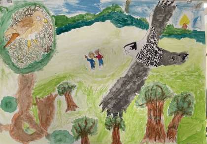 5年生の図工の作品「読書感想画」を紹介します。題は「アオナギの巣立つ森では」です。