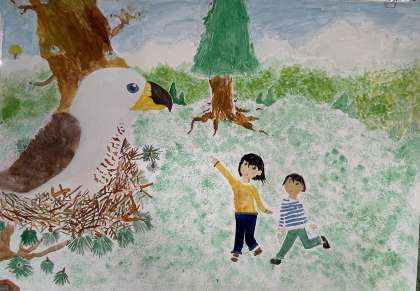 5年生の図工の作品「読書感想画」を紹介します。題は「アオナギの巣立つ森では」です。