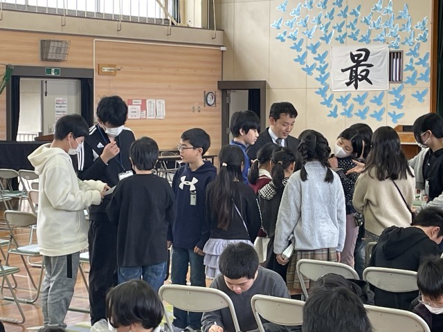 午前の中間放課に、通学班の班長さんが体育館に集まって班長会を行いました。新しい班になって、みんなはりきって「自慢できる通学班」になるようにがんばってくれていますね。でも、うまくできていることがあれば、心配なことや不安なこともありますね。今日は、普段のようすを記録簿に描いて振り返りをしました。担当の先生からもアドバイスをもらいながら、安全になかよく行動できる班をめざしてがんばっていきましょうね。