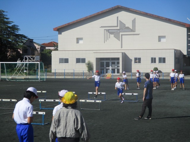ハードルをまたぎ越す時のフォームを意識して練習します。