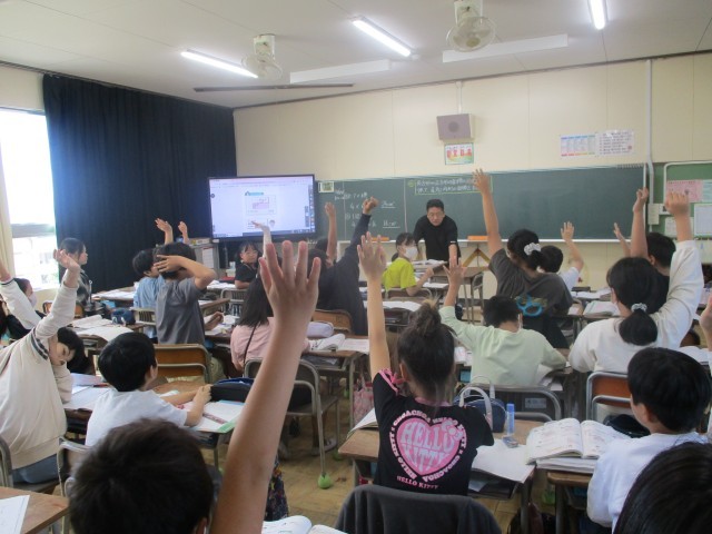 算数の授業の様子です。質問に対してたくさんの挙手があります。