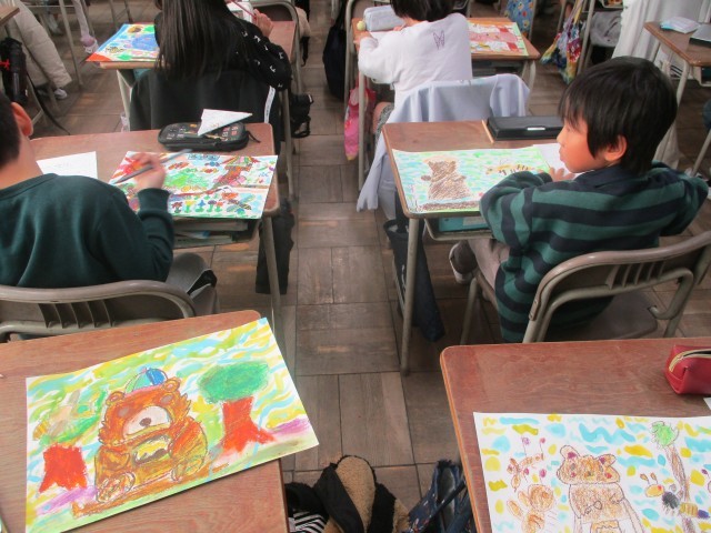 「はちとくま」の物語から場面を選び、絵をかきました。