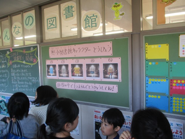 キャラクター投票の前にはたくさんの児童が集まっています。