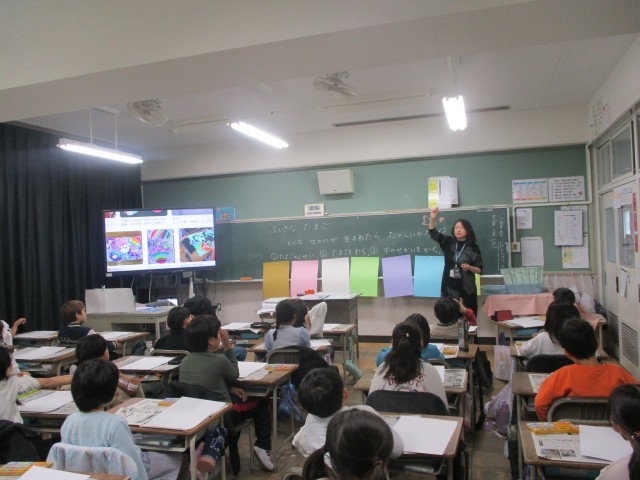説明を聞いたり、よい作品を見たりして考えをふくらませます。