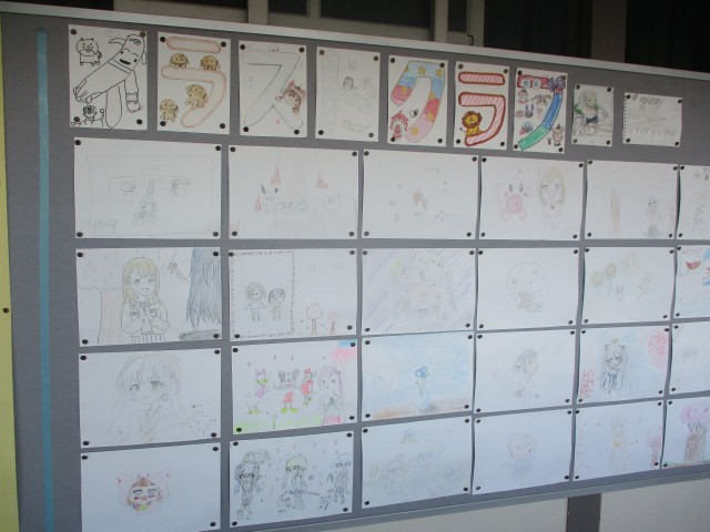 多目的室の廊下にクラブ活動で作成した作品が掲示してあります。