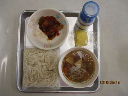 今日の献立は、白玉うどん・牛乳・刻みきつねうどん・とり天の甘酢あん・カットパインです。