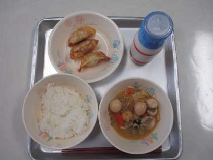 今日の給食は、ごはん、牛乳、八宝菜、揚げギョーザでした。