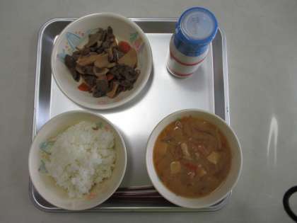 今日の献立は、ご飯、牛乳、豆乳入りみそ汁、牛肉と糸こんにゃくのいり煮でした。