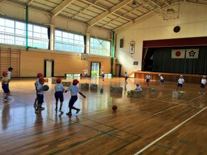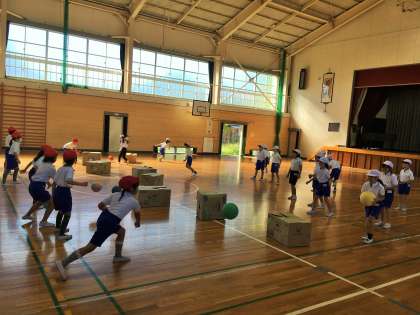 ダンボールの箱を使って、ボール遊びをしました。ダンボールにうまく当たるとたくさん相手のコートに動くので、箱を狙って投げることができました。