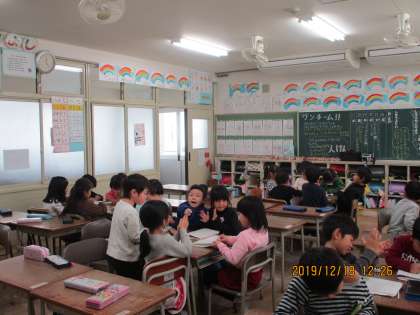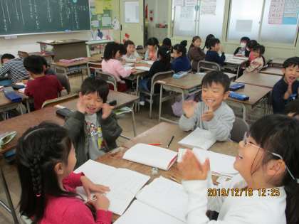 友達が今、楽しいことについてインタビューをしたことのメモを作り、今日は即席のグループごとに発表会を行いました。