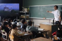 【上】社会では「かわってきた人々のくらし」を学習しています。廊下で「せんたく板」の体験をしていました。「先生!真っ黒だったぞうきんが、こんなに白くなったよ!」