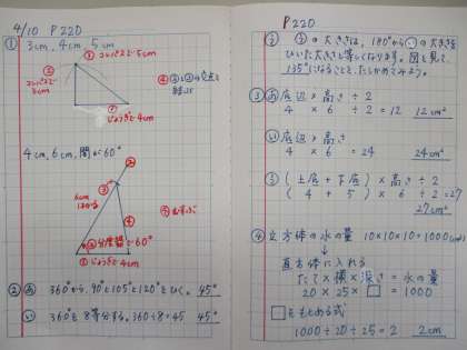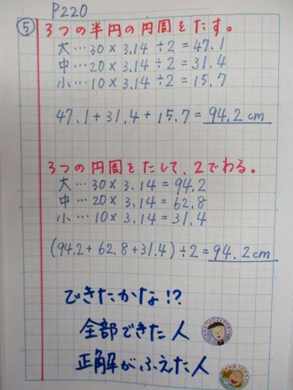 今日はp220の図形の問題の答え合わせです。5年生の復習ですが、6年生でも学習しますので、計算の仕方や公式をしっかり覚えましょう。