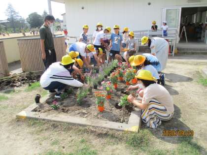 昼の休み時間に、園芸委員会の子どもたちが花壇に苗を植えました。