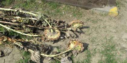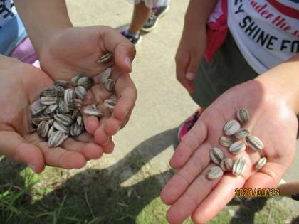 低学年の子が、枯れたヒマワリから新しい命(種)をいっぱい抜き取っていました。