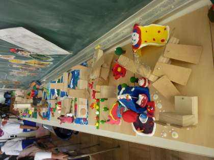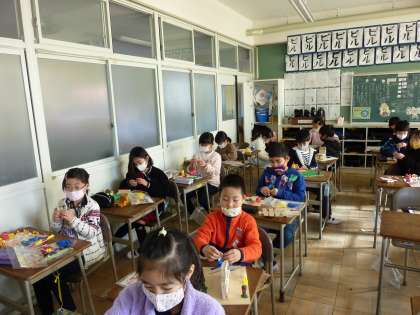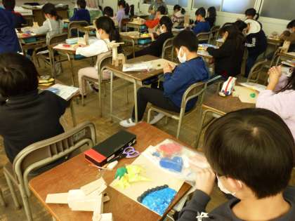 作品展にむけて、準備がすすんでいます。くぎ打ちをする作品に続き、作品をのせるための台や小物を作って、さらに工夫を重ねています。紙粘土は、赤・青・黄色・白のものを組み合わせて、色を作っていきます。混ぜると色が変わるので、色も工夫しながら作品作りを楽しんでいました。みんなに見てもらうとなると気合いが入る子もいます♪一生懸命どの子も作っているので、完成が楽しみです。