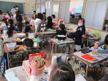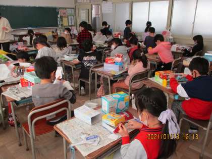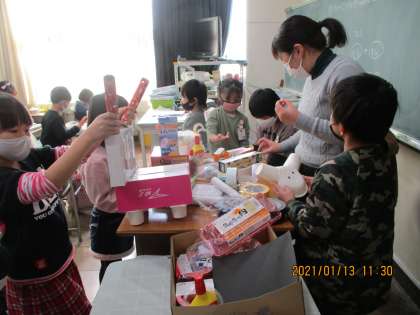 冬休み中に集めたたくさんの箱を使って、何かを作っています。