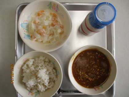 今日の献立は、麦ごはん、牛乳、ポークカレー、オレンジヨーグルトでした。