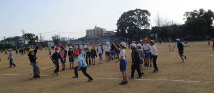 昼放課には、クラスみんなで大縄跳びをしているところがありました。