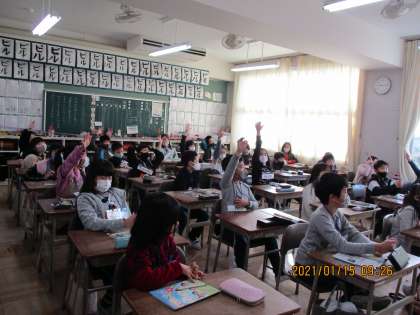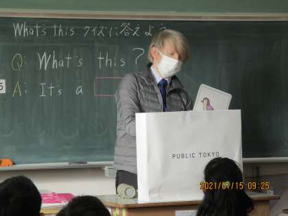 3年生の今日の英語の学習のめあては、「What’s this」クイズに答えよう」です。