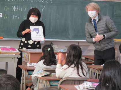 ALTの先生が「What’s this?」と言いながら、仕掛けの後ろから少しだけ動物カードを見せてくれます。横から少しのぞかせたり、一瞬でピョンととびあがったりするので、みんな真剣です。そして、カードの動物がわかると、「It’s a 〜 !」と元気よく答えます。うっかり、動物名だけ答えてしまった時には、みんなで「It’s a 〜 と答えるよ。」と声を掛け合います。