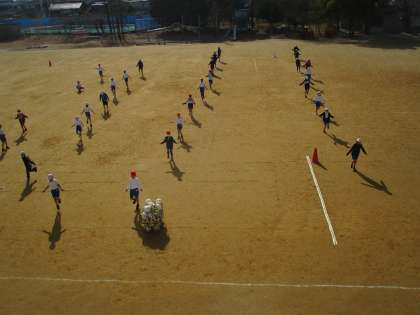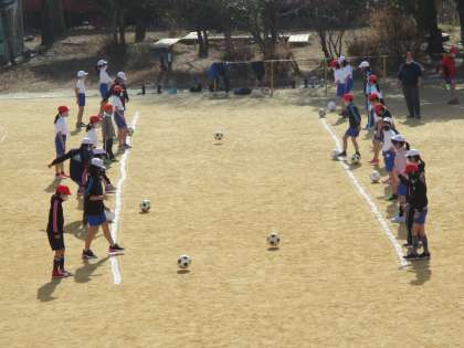 リズム縄跳びで体を慣らした後、サッカーに取り組みました。