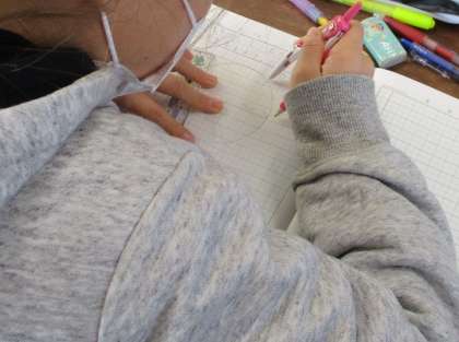 「まずやってみようか」の先生の掛け声に、子どもたちは早速ノートに円をかきはじめました。