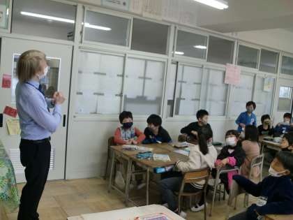 ヨウニ先生と英語の学習をしました。グループに分かれて問題を選び、グループで協力して答えを考え得点を競いました。